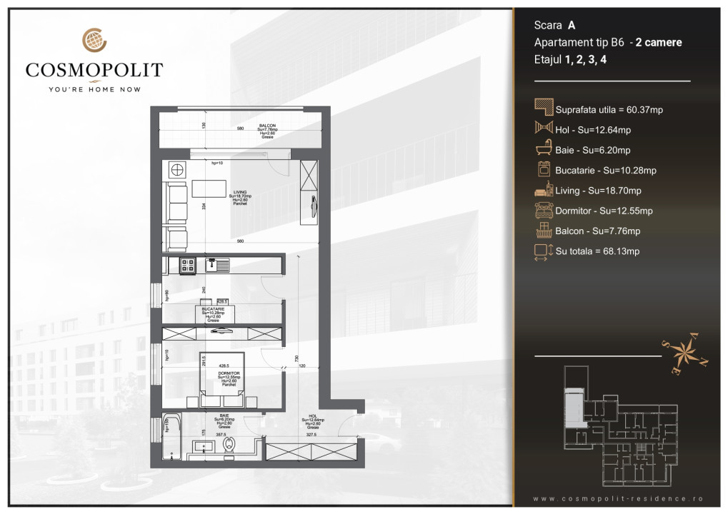 Apartamentul este situat in proiectul Cosmopolit Mihai Viteazul 1-3, cel mai complex proiect imobiliar realizat de noi până acum. Complet finisat cu ceramice premium, parchet stratificat, baie complet echipata si utilata, centrala proprie si sistem de incalzire in pardoseala, apartamentul dispune de o pozitionare estica, cu vedere spre curtea interioara. Fiind foarte aproape de centrul istoric, de noul centru al Brasovului si de Aula Universitatii Transilvania este ideal si pentru exploatarea in regim hotelier.